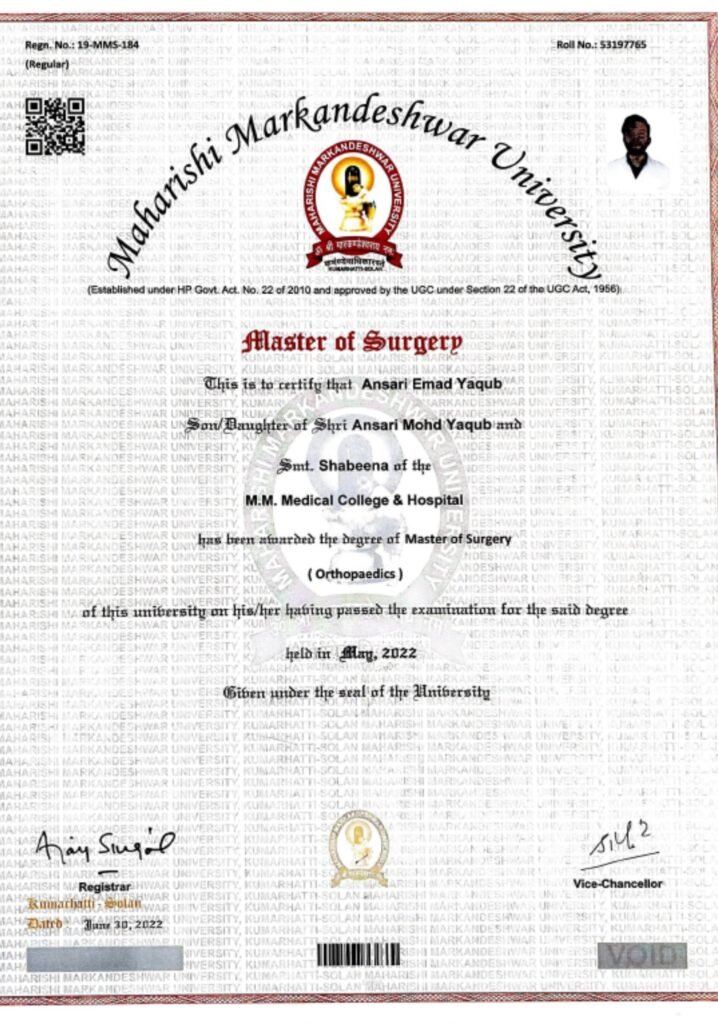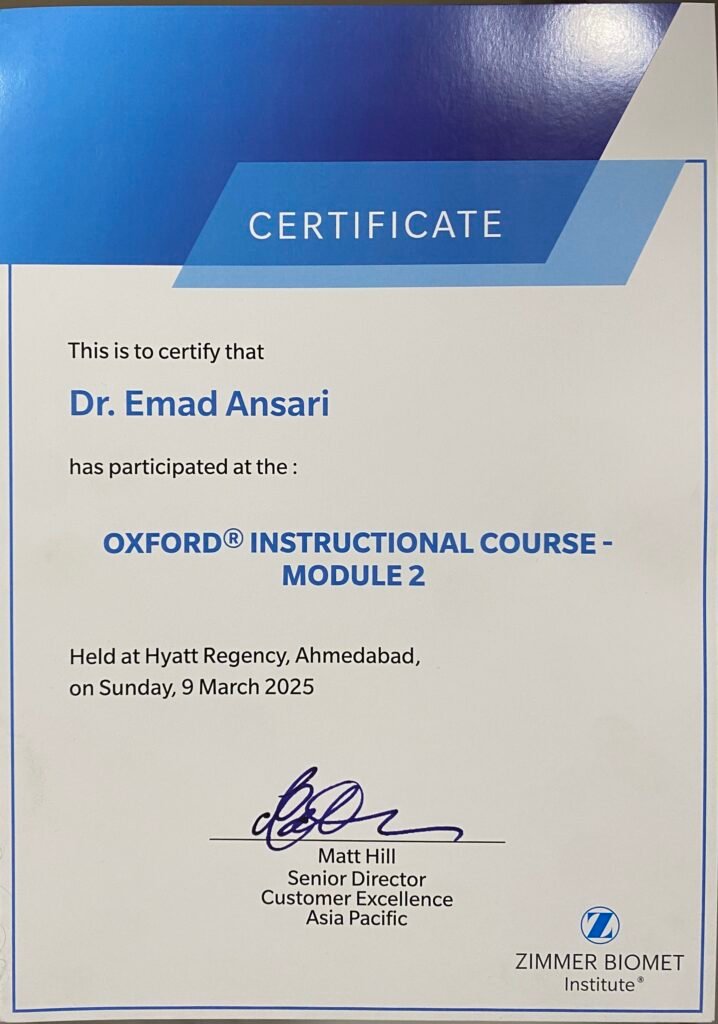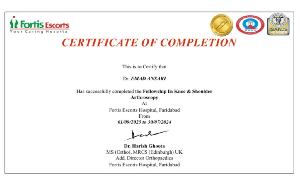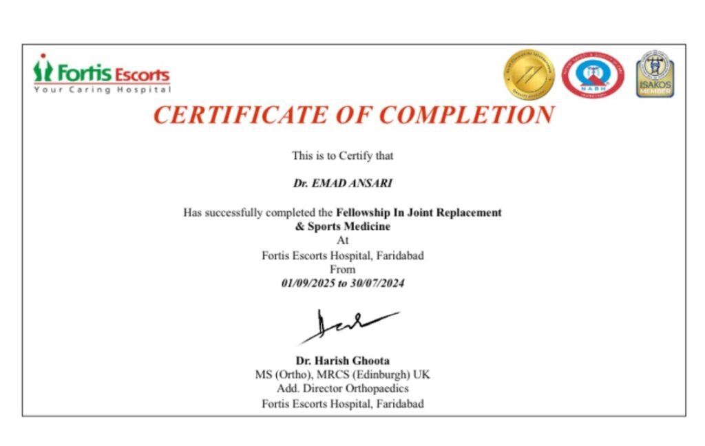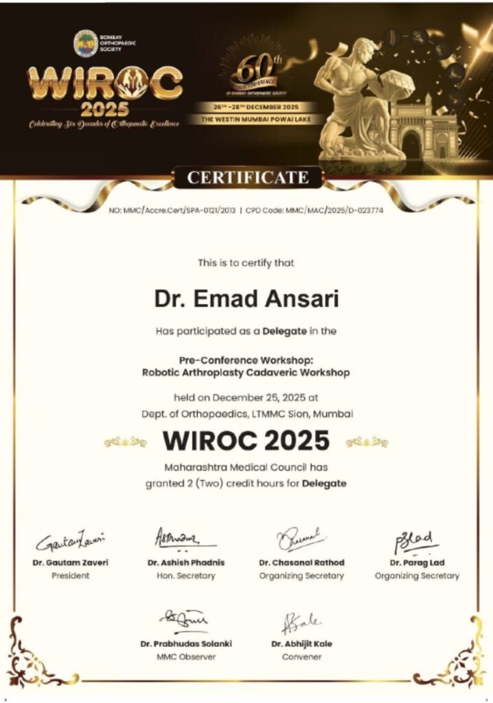 Dr. Emad Y. Ansari (MBBS, MS Ortho, FIJR – Fellowship in Joint Replacement, FISM – Fellowship in Sports Medicine, FIFA Diploma in Sports Medicine) is a renowned orthopaedic surgeon in Bhiwandi with extensive expertise in fracture surgeries and joint replacement procedures.